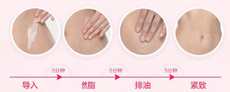 在需要减肥的部位进行打圈按摩,膏体逐渐转化为乳状。有微微发热的感觉,那就是EAORON独有的超微分子精油正在快速渗透到脂肪层,靶向定位,进行燃烧脂肪、溶解多余脂肪的过程。