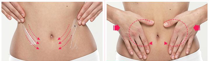step 2:双手放在腰部两侧向中间推,在肚脐眼两侧打圈按摩,会让腰部肌肤更加紧致哦。