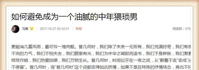 最近,作家冯唐“如何避免成为一个油腻的中年猥琐男”一文更是引爆“油腻”和“中年男人”的争端。