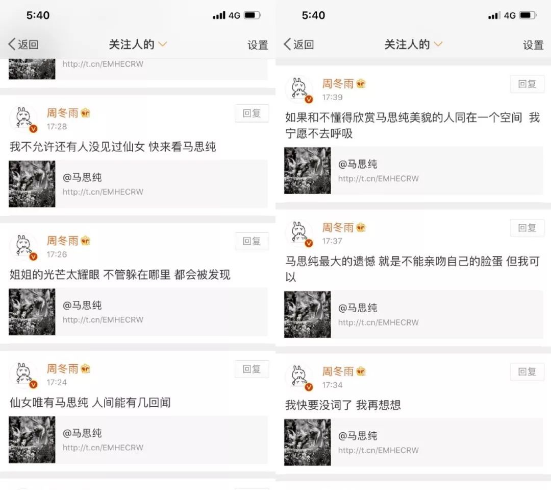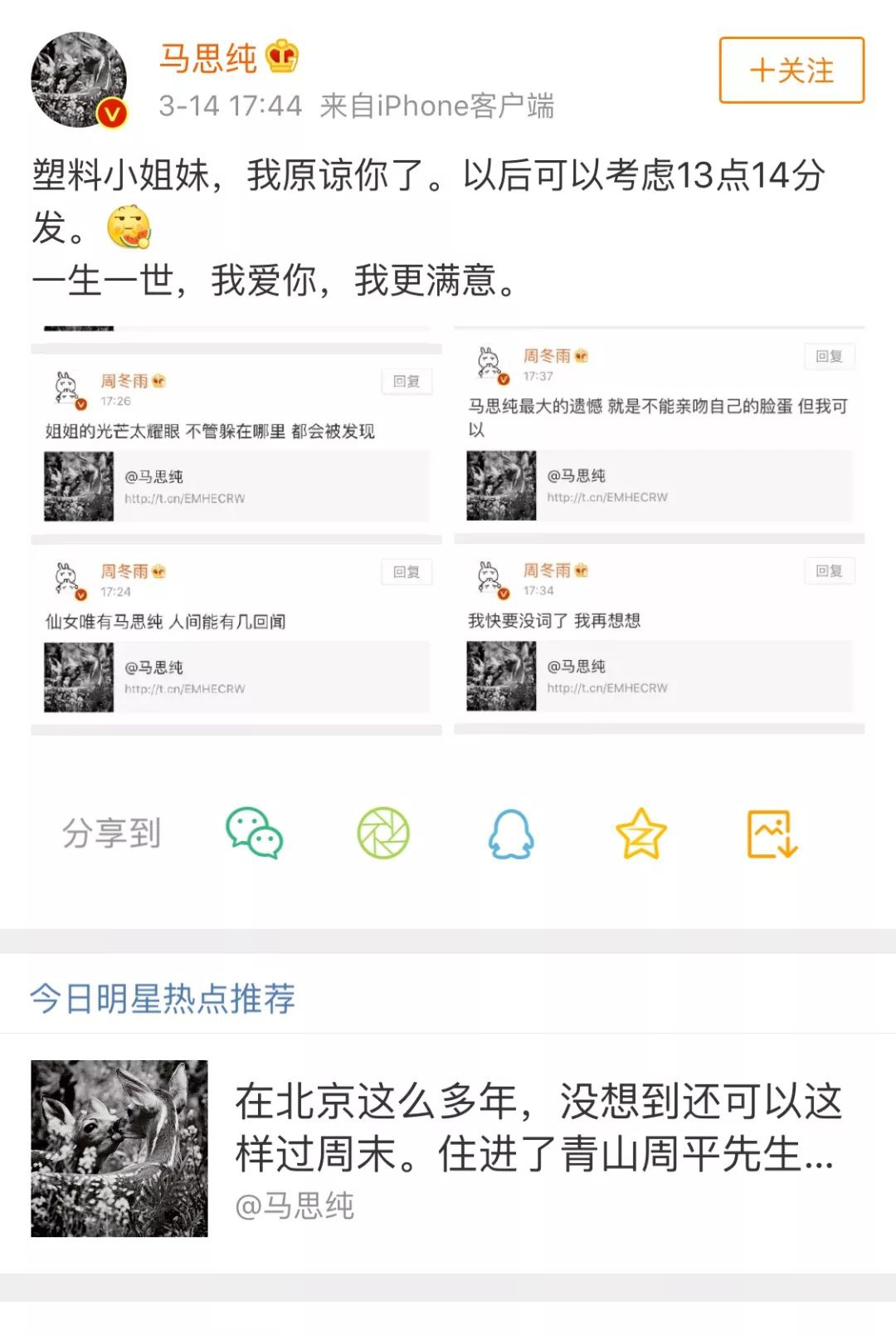 ▲小马姑娘的最大CP,小黄鸭周冬雨的祝福绝对不能忽略,生日当天,周冬雨在微博整整吹了十几条彩虹屁为马思纯庆生。